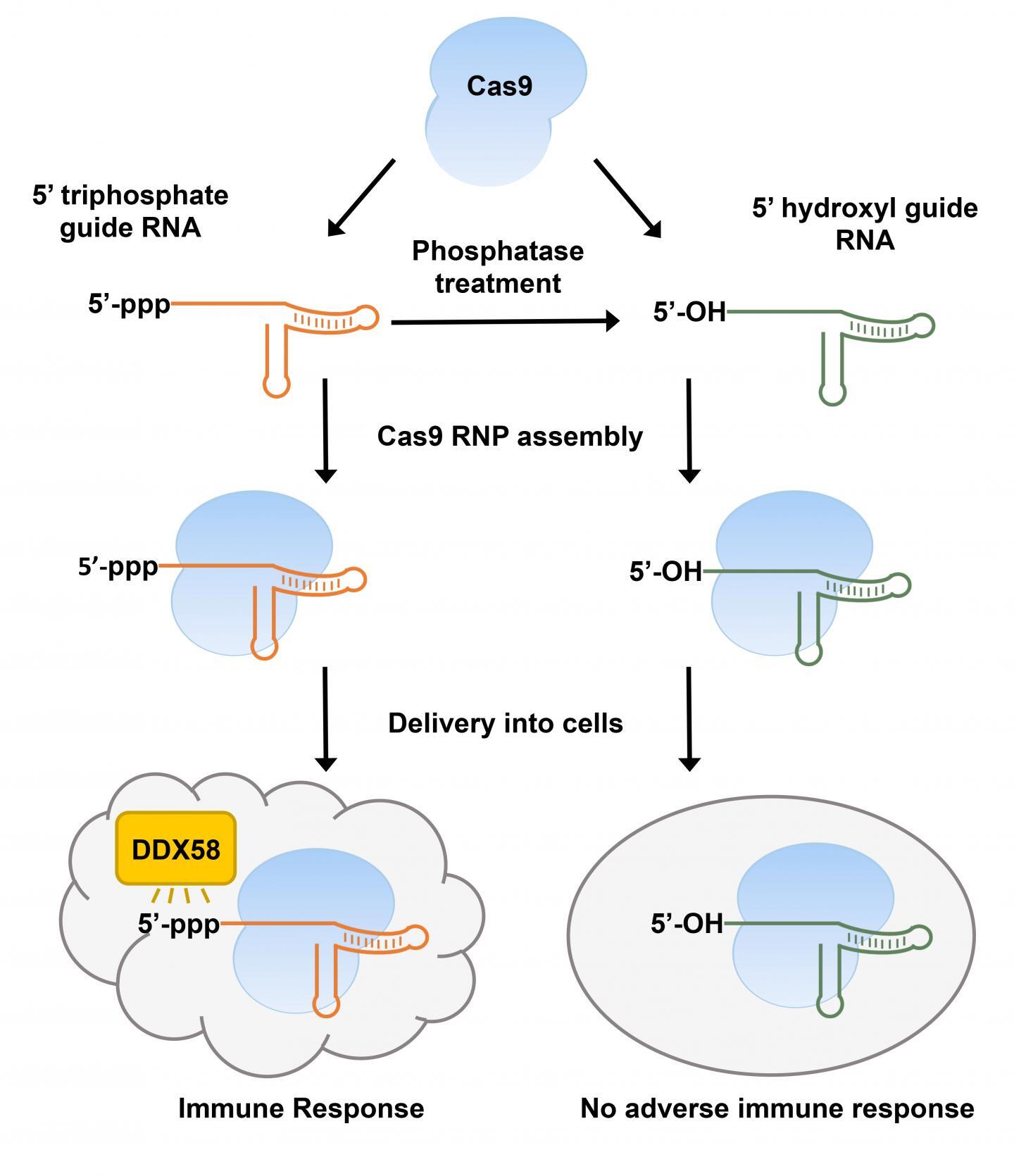 Figure: In vitro transcribed-CRISPR guide RNAs trigger innate immune response in cells, but can be prevented by removing the triphosphate moiety